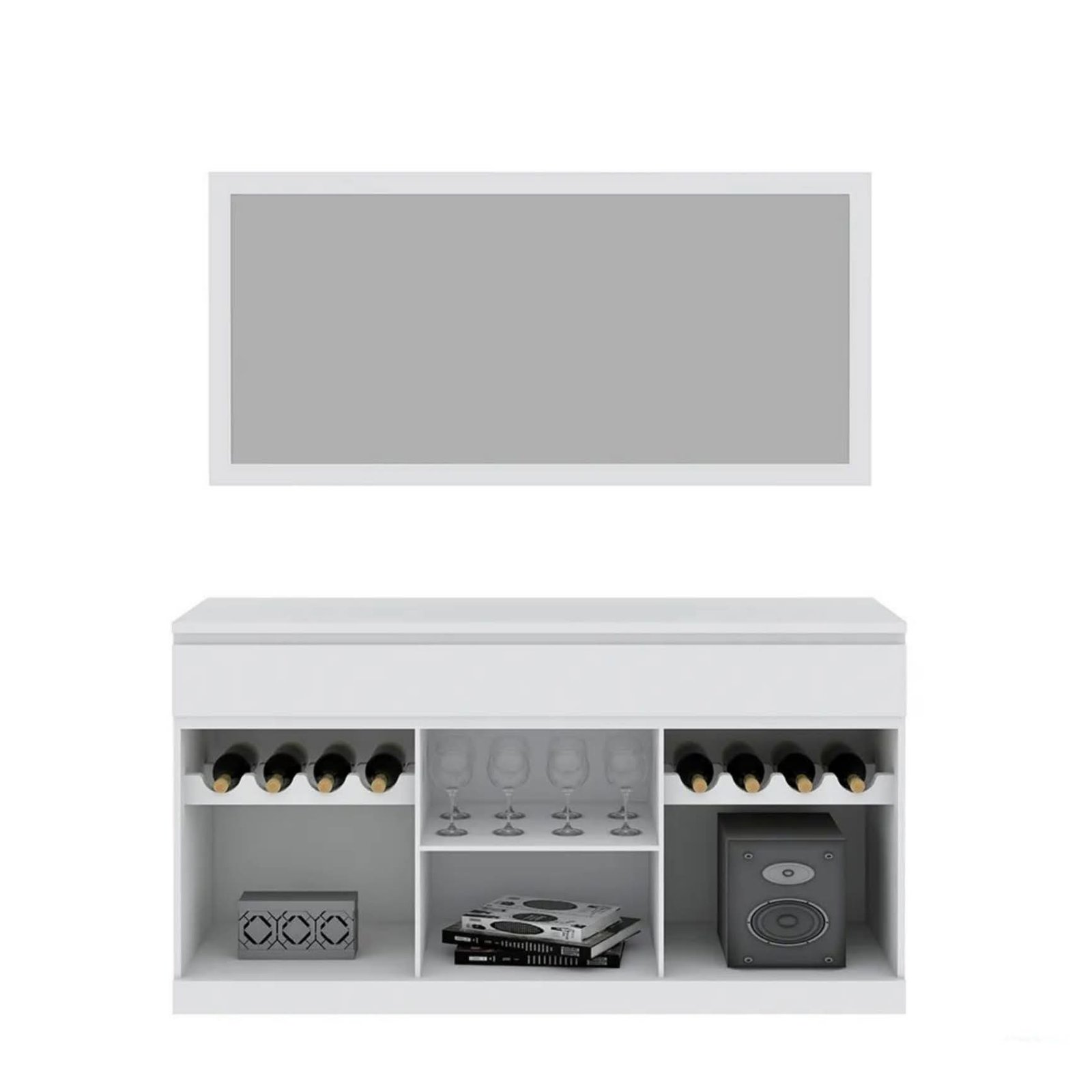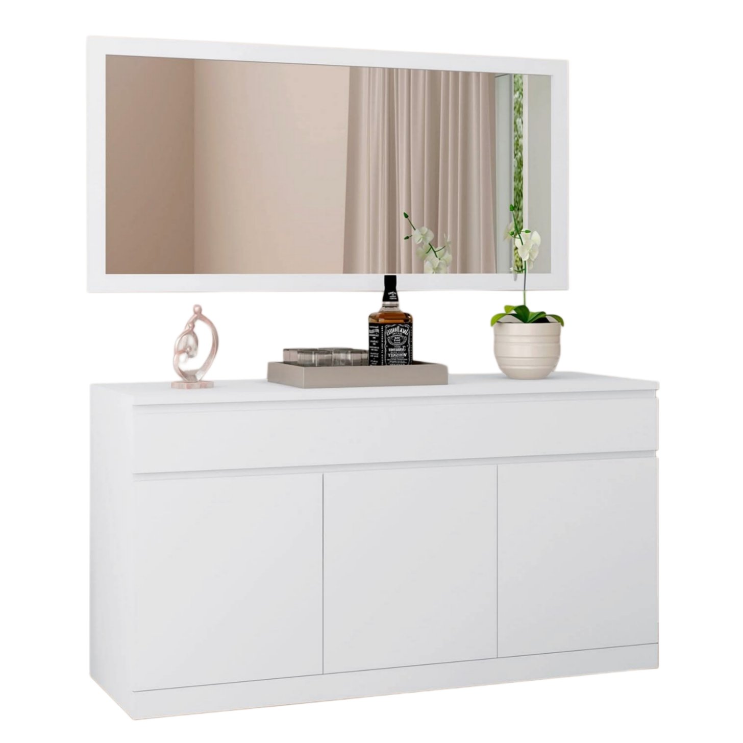 Aparador Imperial com 3 portas, 3 prateleiras internas e espelho incluído. Design elegante em branco, ideal para organizar e valorizar salas, halls e corredores.