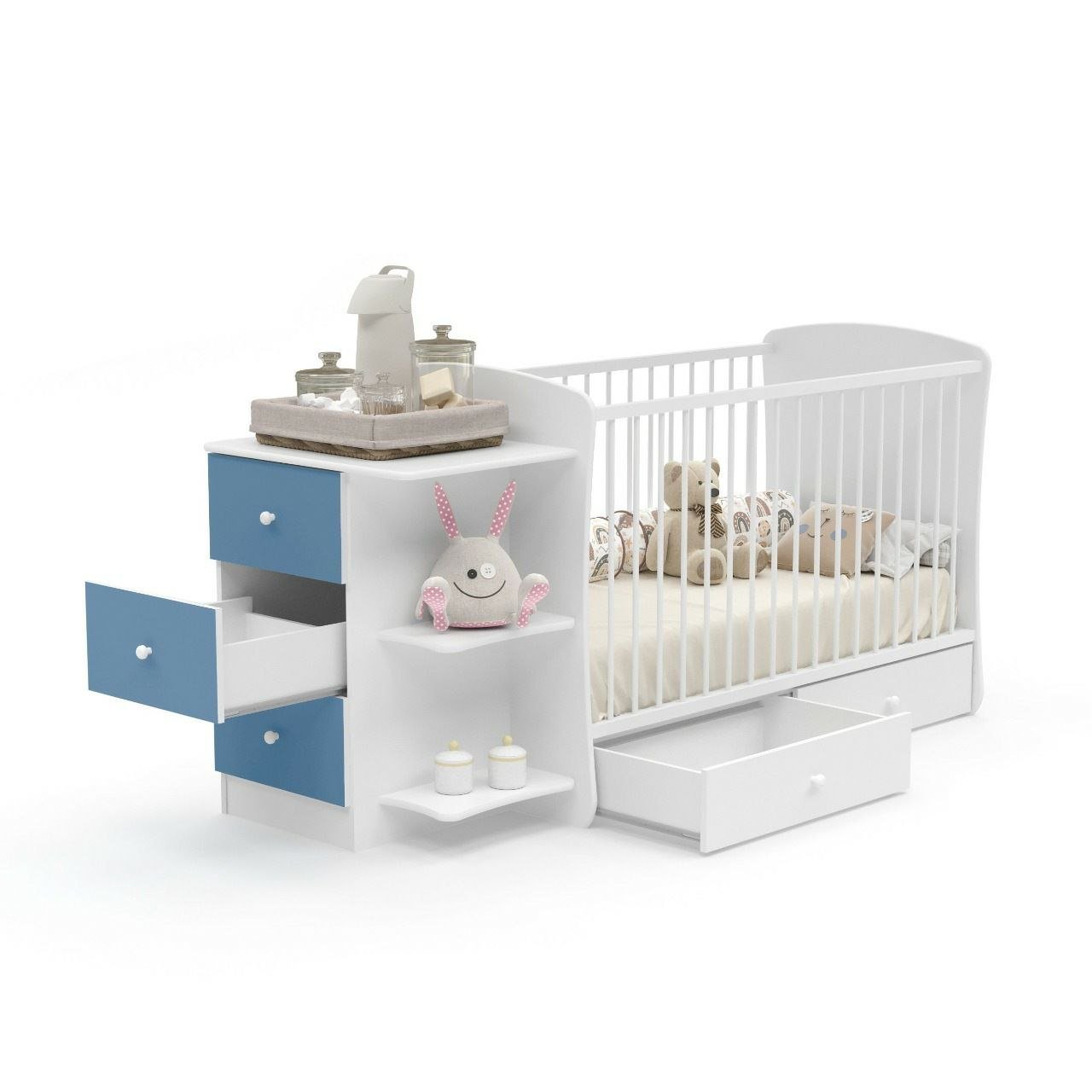 Funcional e cheio de estilo, o Berço Golden Azul é ideal para quem procura conforto e organização no quarto do bebé. Com 5 gavetas (03 frontais e 02 laterais maiores), oferece espaço extra para guardar roupas, fraldas e outros artigos essenciais.