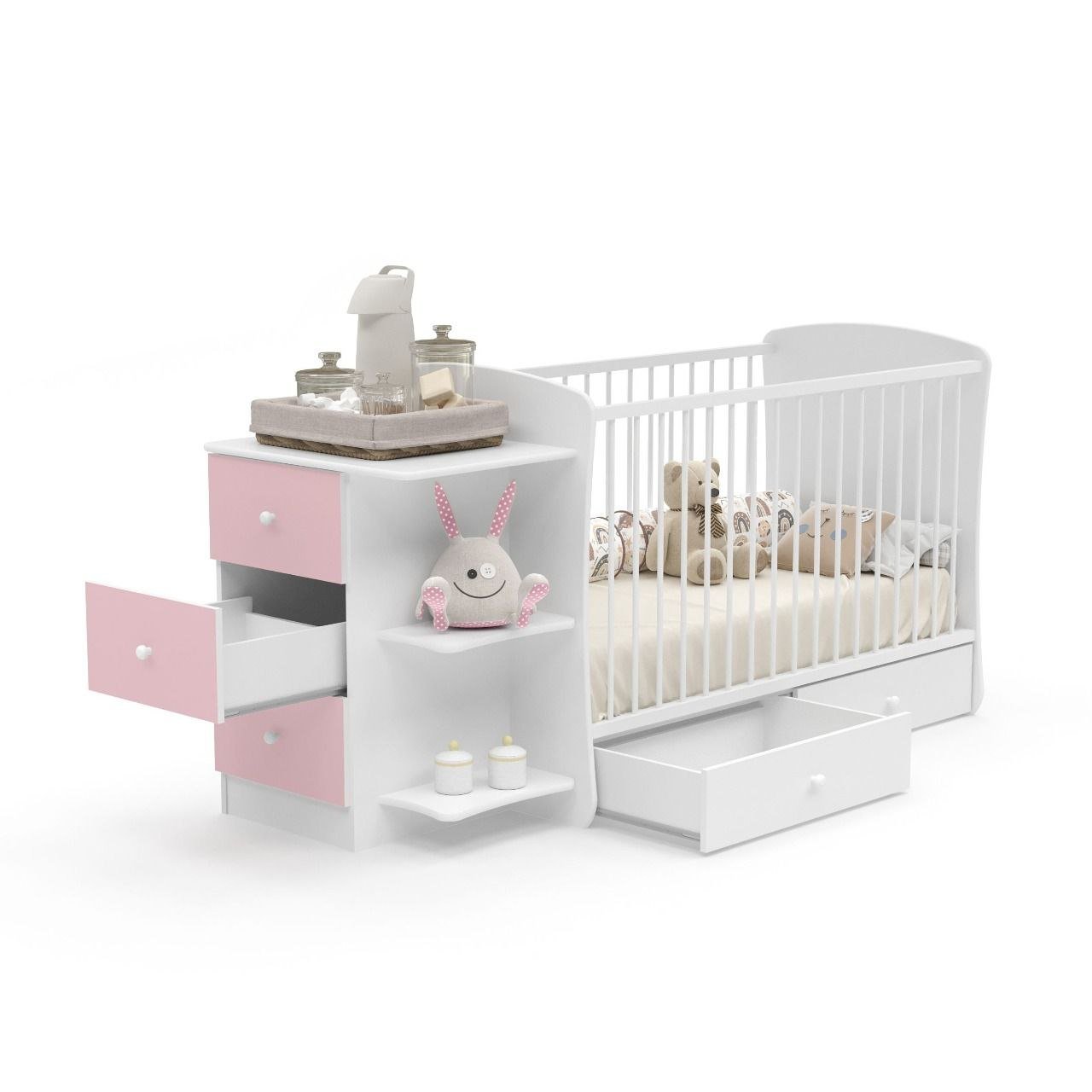 Berço Golden com 5 gavetas (3 frontais e 2 laterais maiores), espaço extra para arrumação e tampo superior multifuncional. Ideal para organizar fraldas, roupas e acessórios da bebé.