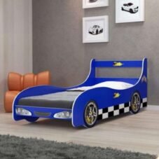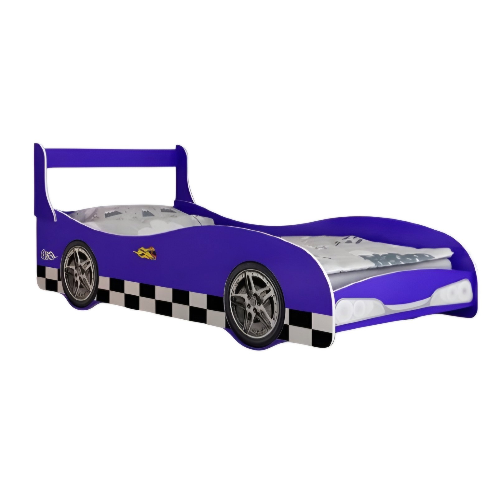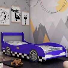 Cama Rally em formato de carro de corrida com acabamento em azul vibrante. Design temático que estimula a imaginação e traz diversão ao quarto da criança.