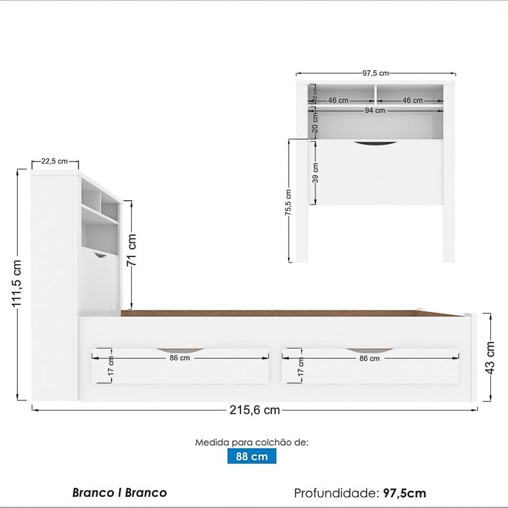 Medida indicada para colchão: 88 x 188 cm
