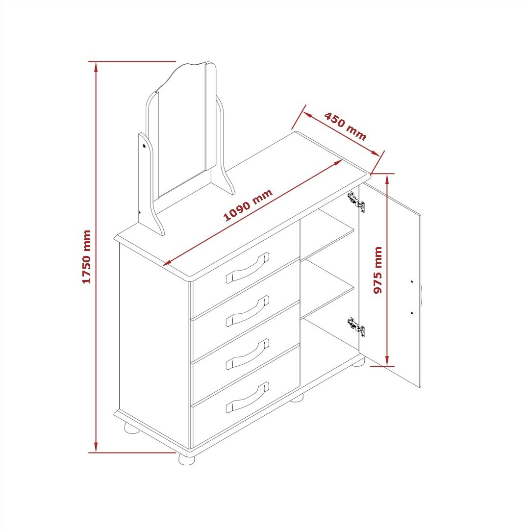 A: 96 cm (até 175 cm com espelho) x L: 109 cm x P: 45 cm — Peso: 42,5 Kg