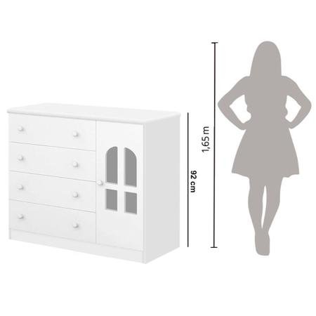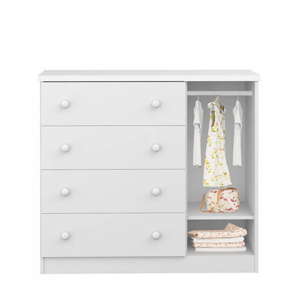 Cômoda Alvin com 4 gavetas espaçosas e 1 porta com cabideiro interno. Design funcional e cor flexível com opções de montagem em branco, branco-rosa ou branco-azul.