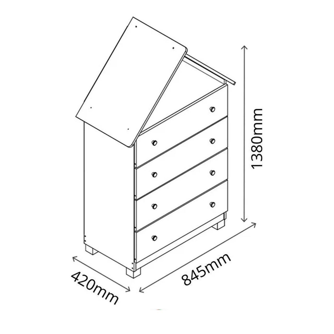 Cômoda em forma de casinha com 4 gavetas espaçosas. Ideal para organizar roupinhas e estimular a imaginação da criança, com design lúdico e acabamento em Pink Ploc.