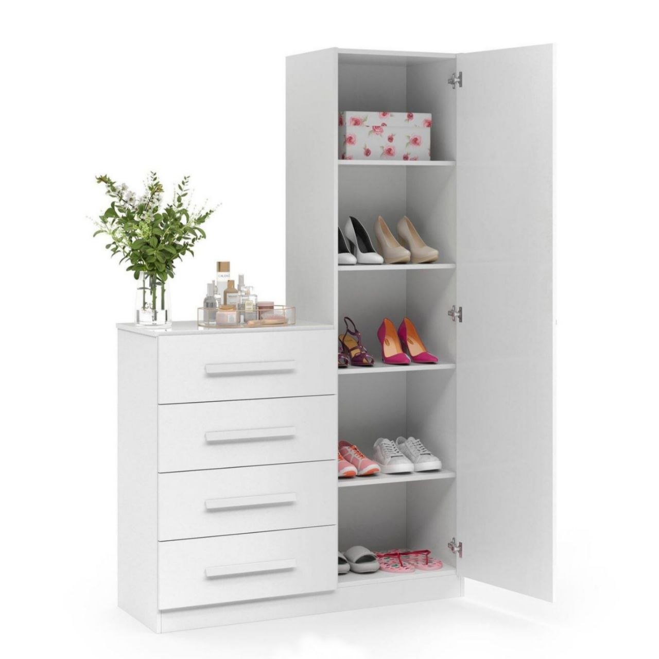 Cômoda Sapateira Dubai Branco — prática e elegante. 4 gavetas e 1 porta com espelho “corpo inteiro” para organizar sapatos, roupas e acessórios.