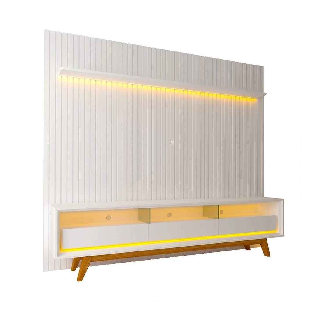 Conjunto com painel ripado 2,75m e rack Requinte em branco. Estrutura em MDF, pés em madeira maciça, vidro de 8mm e acabamento premium. Ideal para salas modernas com TVs até 85″.