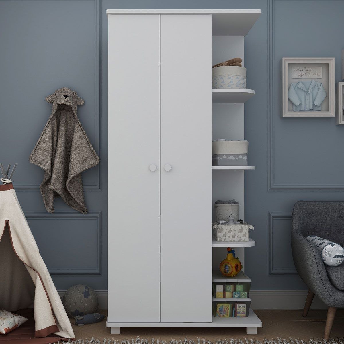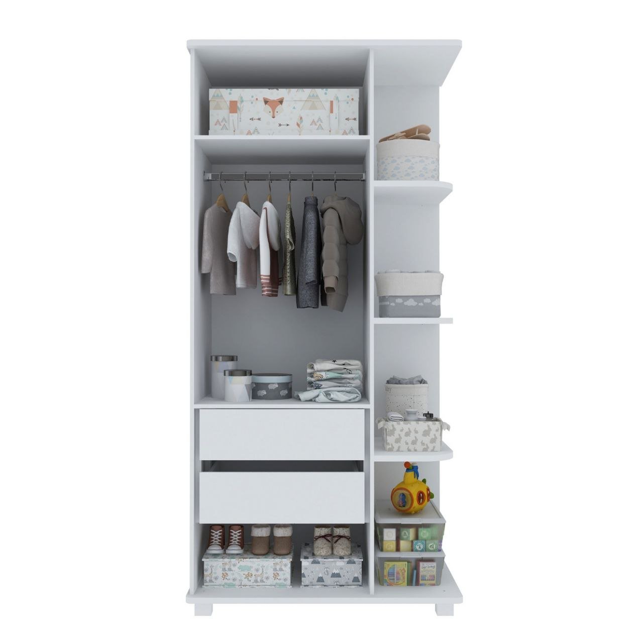 O Guarda-Fato Bebê Golden é uma solução prática para organizar o quarto do bebê. Com 02 portas, 02 gavetas, 01 cabideiro e 04 prateleiras, ele oferece amplo espaço para armazenar roupas, acessórios e outros itens essenciais de forma organizada. Ideal para manter tudo ao alcance, com um design funcional e elegante.