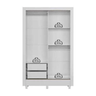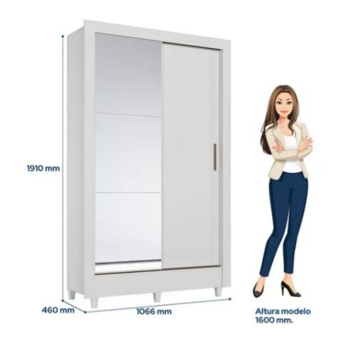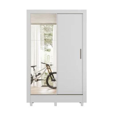 Guarda-fato Bélgica com 2 portas, espelho, 2 gavetas com corrediças metálicas e cabideiros em alumínio. Design elegante e funcional para quarto de solteiro com alto padrão.