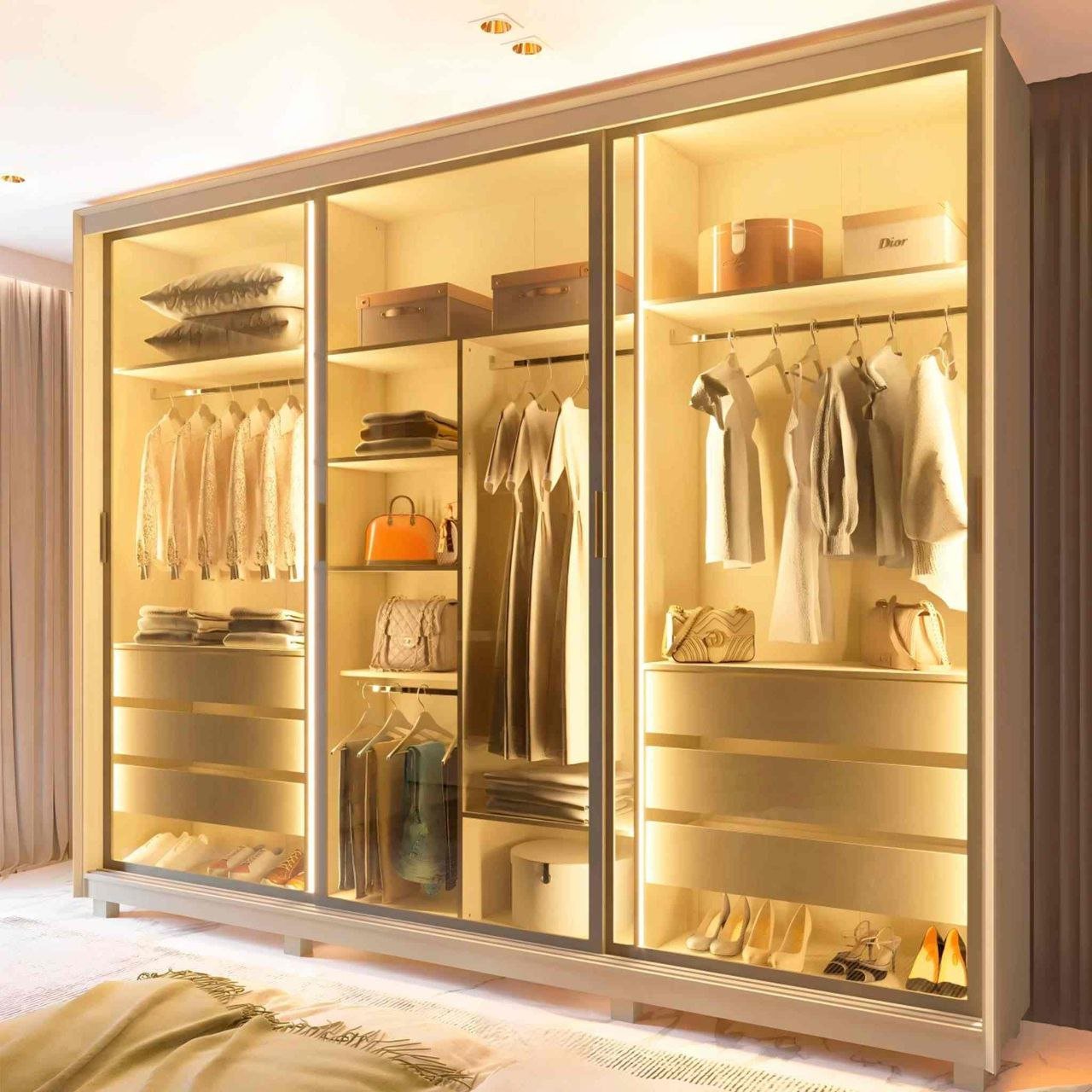 Guarda-Fato casal Platinum – 03 portas em vidro reflecta e LED. Design luxuoso, iluminação sofisticada e amplo espaço interno. Consulte entrega em Luanda.