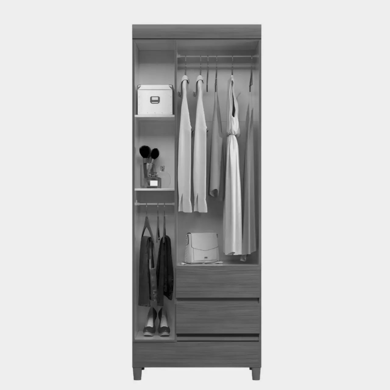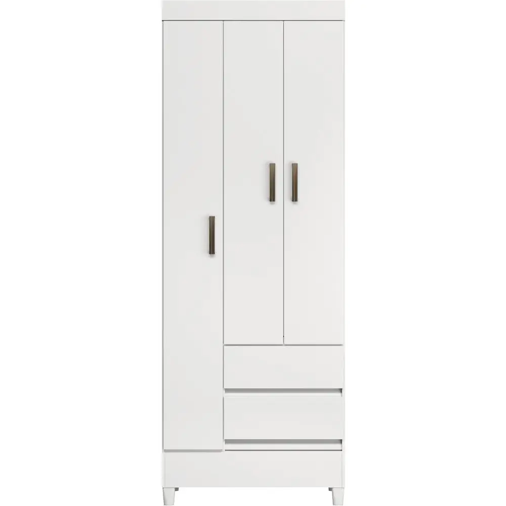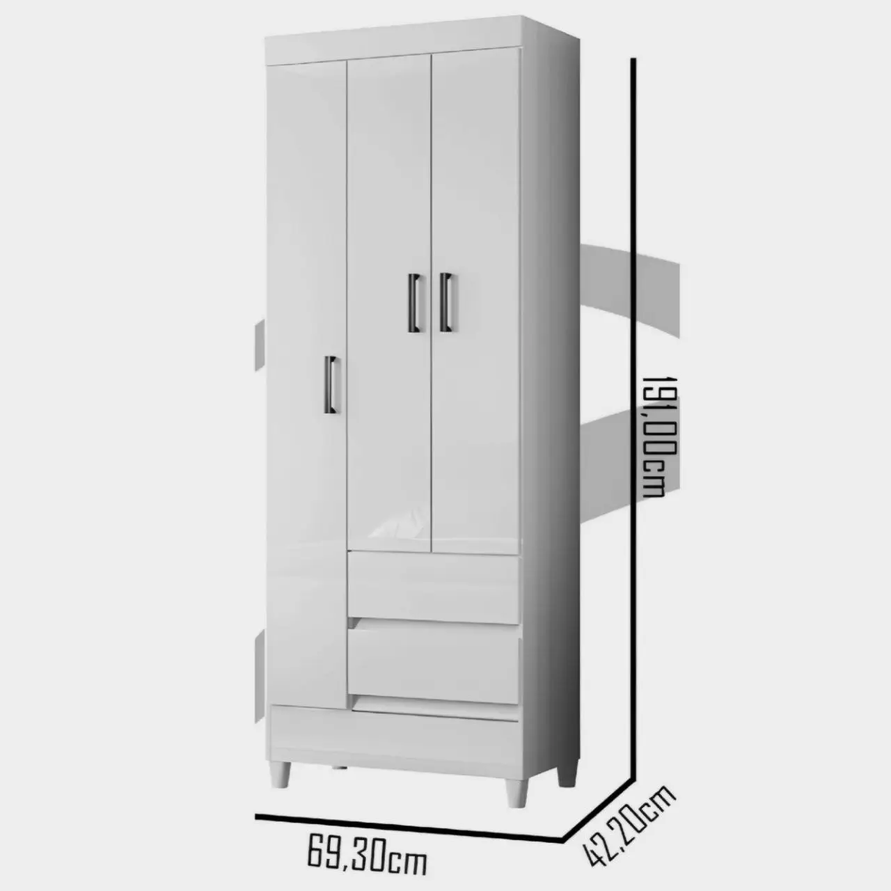 uarda-fato Fit com 3 portas, 2 gavetas com corrediças metálicas, cabideiro em alumínio e pés elevados. Acabamento brilhante, estrutura funcional e sustentável para quarto de solteiro.