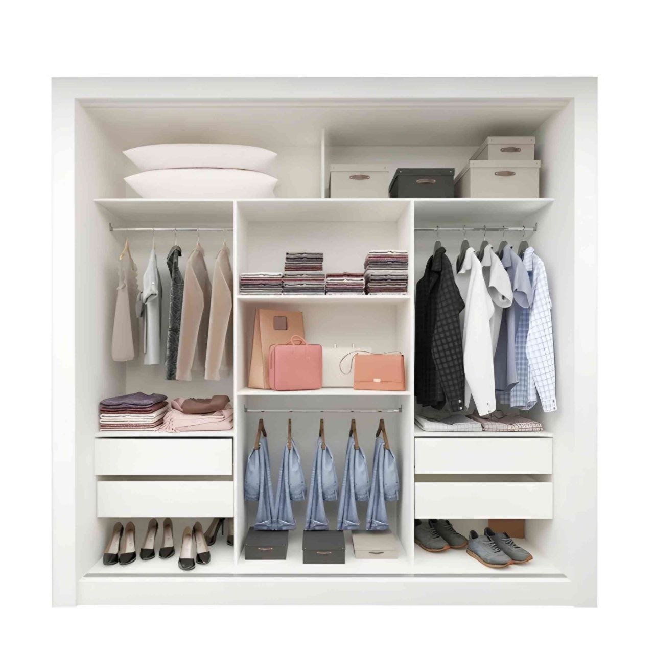 O Guarda-Fato casal Milão 03 portas com espelho conta ainda com 4 gavetas funcionais e 4 prateleiras internas bem distribuídas, ideais para roupas, acessórios e sapatos. Compacto e versátil, adapta-se facilmente ao seu espaço, mantendo a roupa organizada com estilo e conforto.