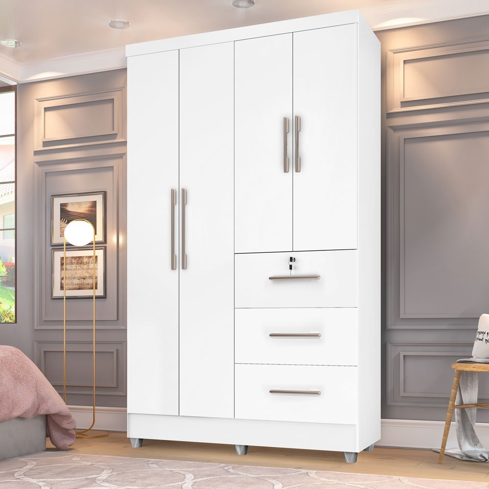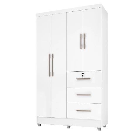 Guarda-fato Tokio com 4 portas, 3 gavetas e cabideiro. Design compacto, acabamento brilhante e combinação Branco/Branco Lilás Flex para quarto de solteiro moderno.