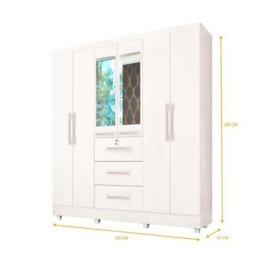 Guarda-fato Tokio com 6 portas, 3 gavetas, 2 espelhos e 3 cabideiros. Acabamento brilhante, estrutura em MDP e design moderno para quarto com muito espaço e estilo.