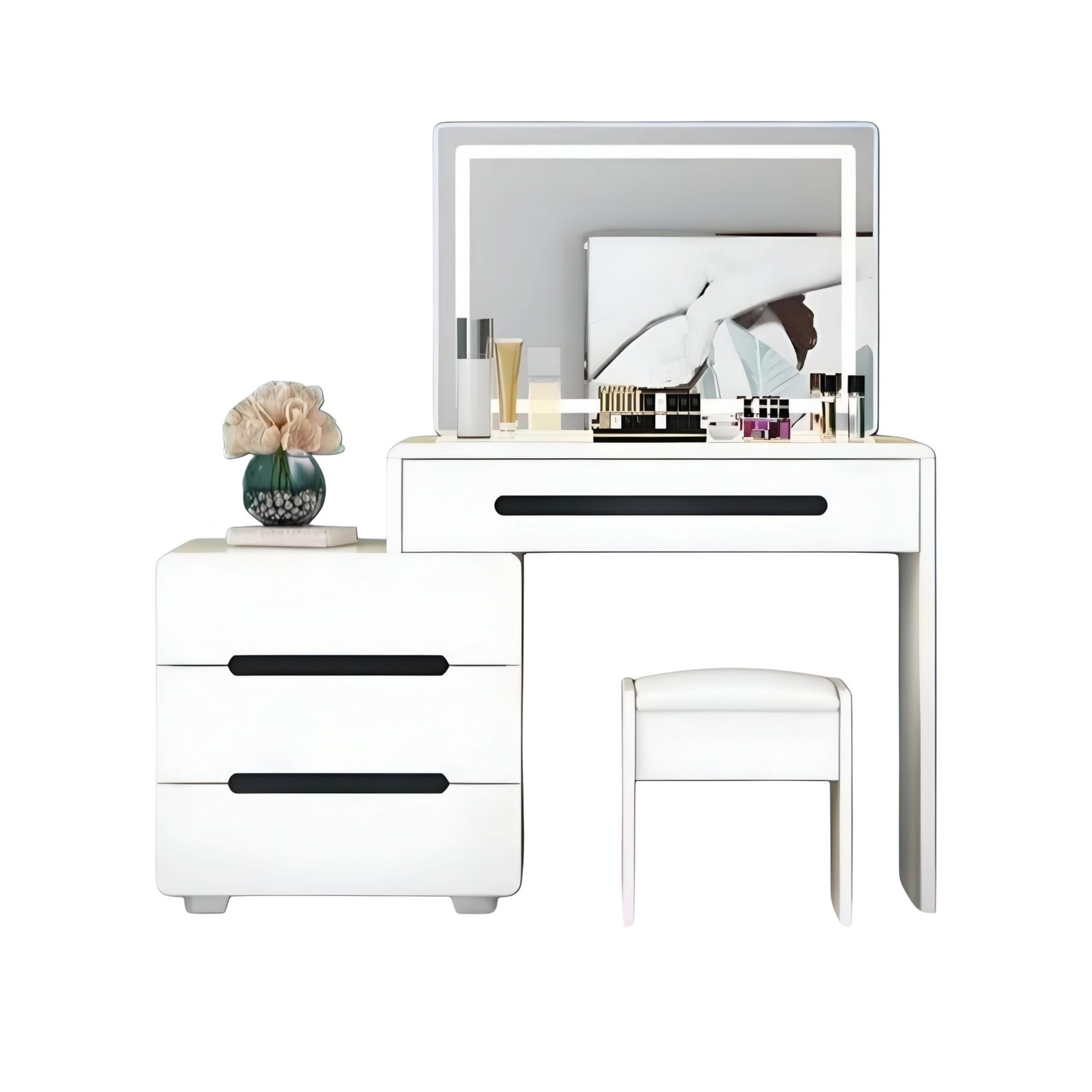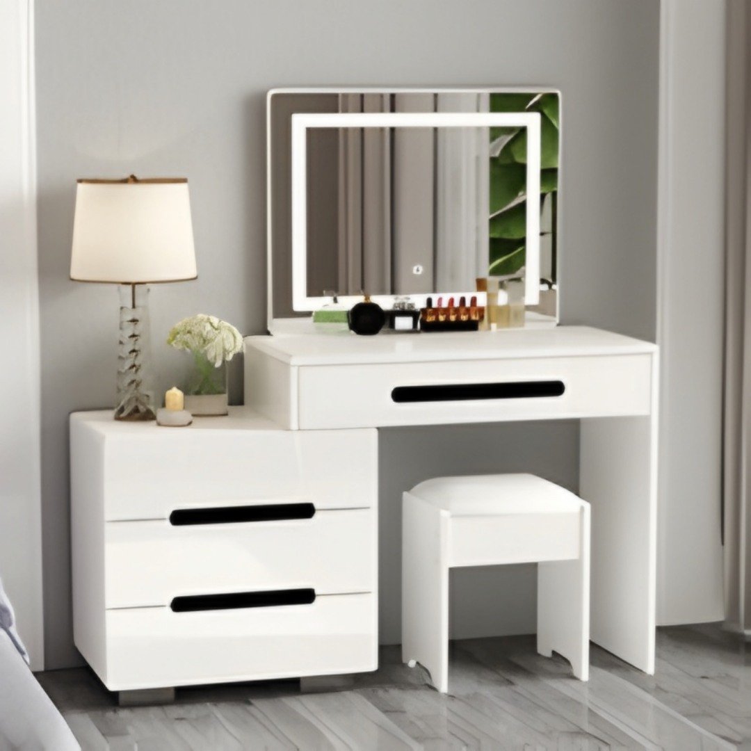 A penteadeira Reflecta oferece o equilíbrio ideal entre beleza e funcionalidade. Com espelho iluminado por LED, banco resistente e boa capacidade de arrumação, é perfeita para a sua rotina de cuidados e maquilhagem.